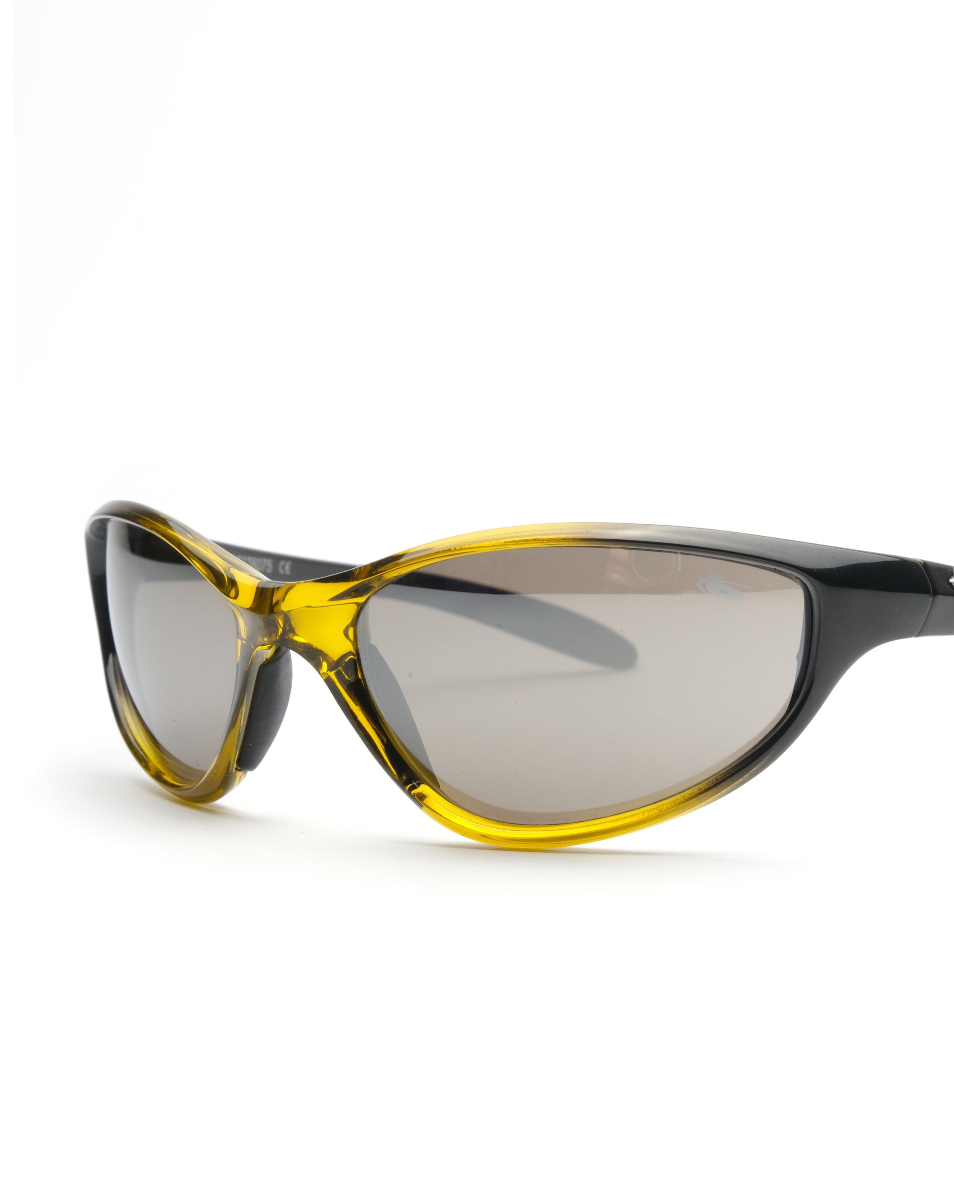 Gradient transparent yellow to black frame, fitted with reflective coated lenses.