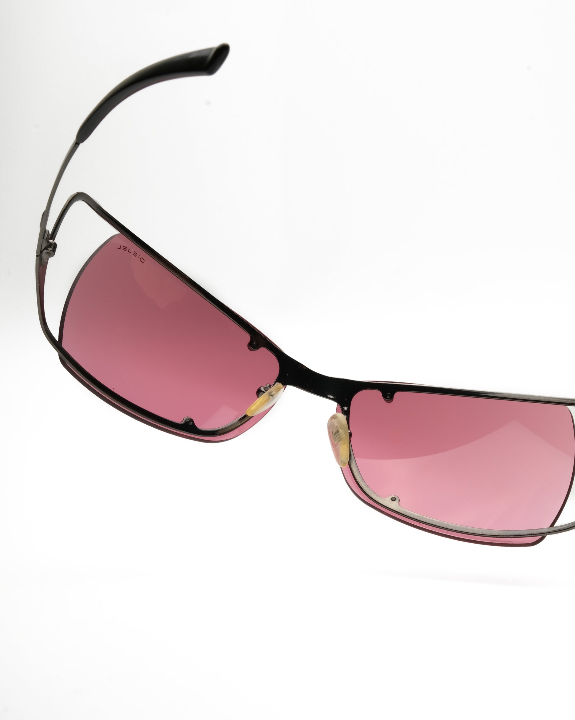 Gunmetal frame with open edges, fitted with overlaid pink lenses featuring a subtle reflective coating.