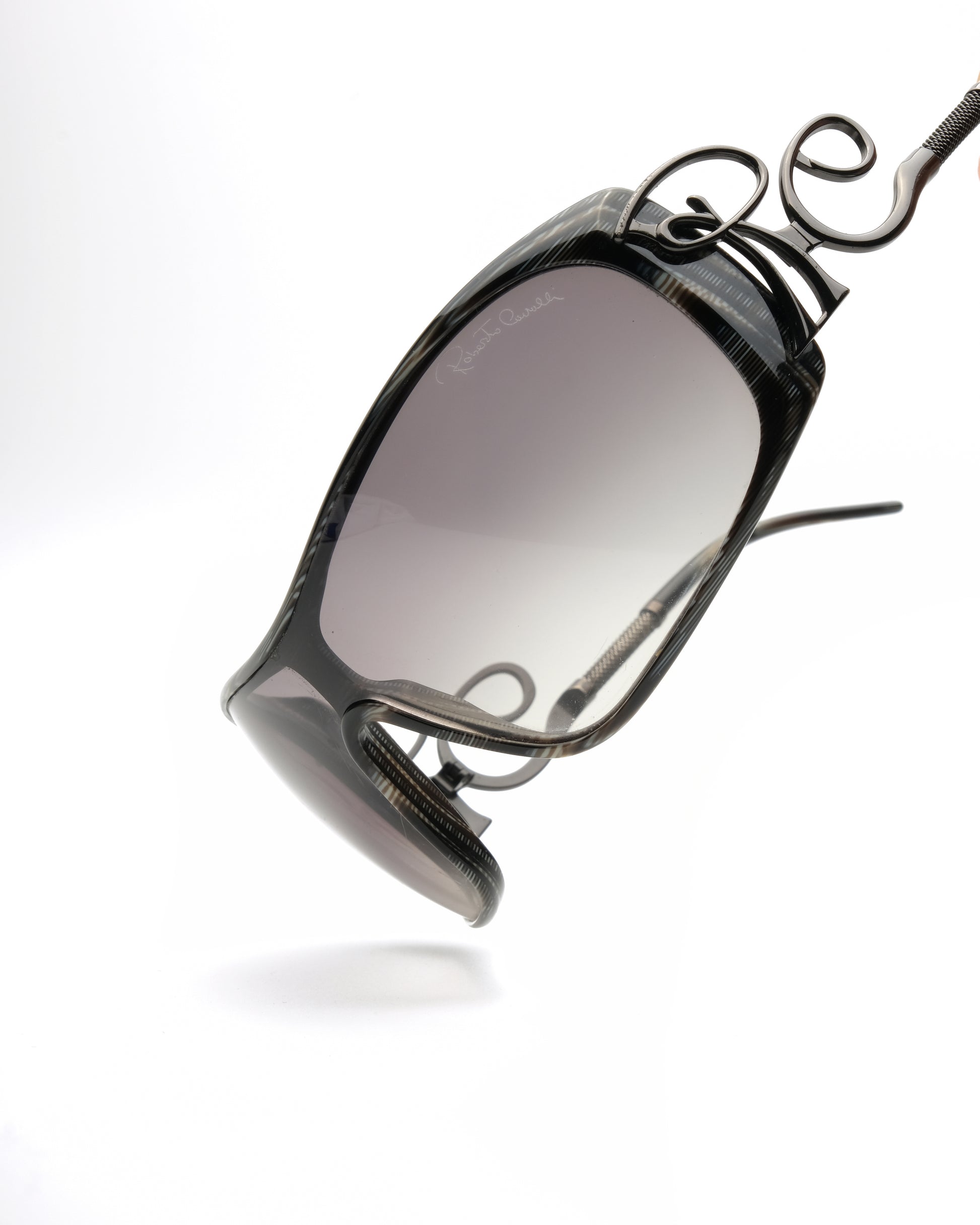 Frame front with a tonal composition combining shades of brown, beige, grey, and black, fitted with gradient lenses. Intertwined metal loops forming the RC monogram connect to textured metal sections and horn-patterned acetate temple tips. The composition of metal and horn-like finishes evokes the crafted detail of early decorative objects.